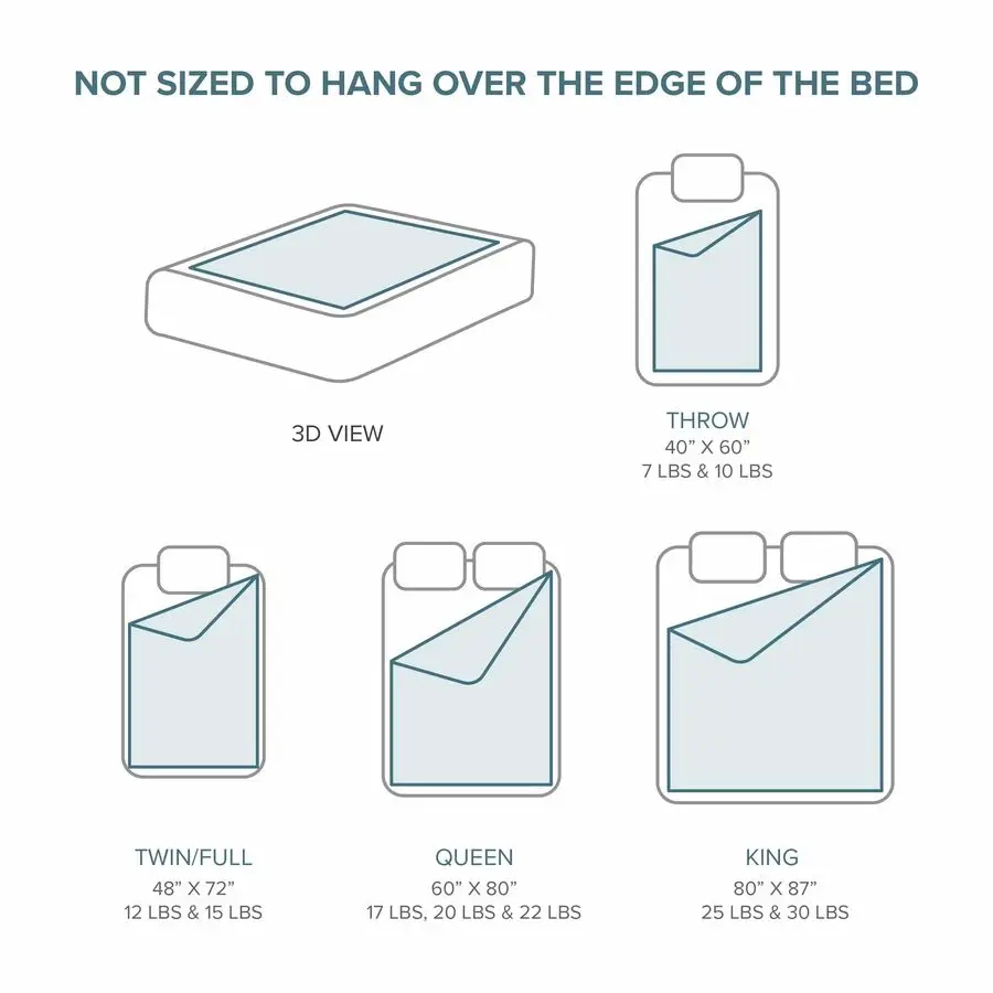HOW TO CHOOSE The weight of the blanket should be about 10 of your body weight. For example, a 150 lb adult would use a 15 lb weighted blanket, and a 65 lb child would use a 7 lb weighted blanket. The blanket should be no longer in size than the top of your mattress and should not hang over the sides of your bed. Please reference our chart to determine which blanket is right for you.